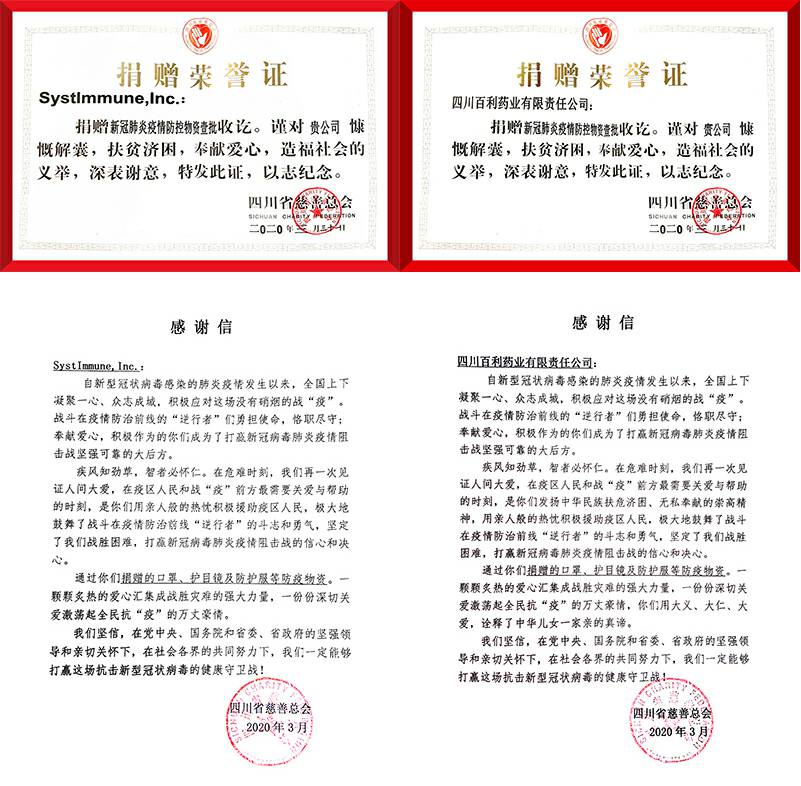 吉林修宇会展策划服务有限公司携手美国西雅图免疫,中美企业共同通过四川慈善总会,向四川和湖北等一线医院分批次捐赠医用外科口罩和N95口罩、护目镜、防护服等防护用品。向全国几十家医院捐赠抗病毒药物新博林(利巴韦林颗粒)和提高免疫的好好黄芪颗粒等,助力一线医护抗疫